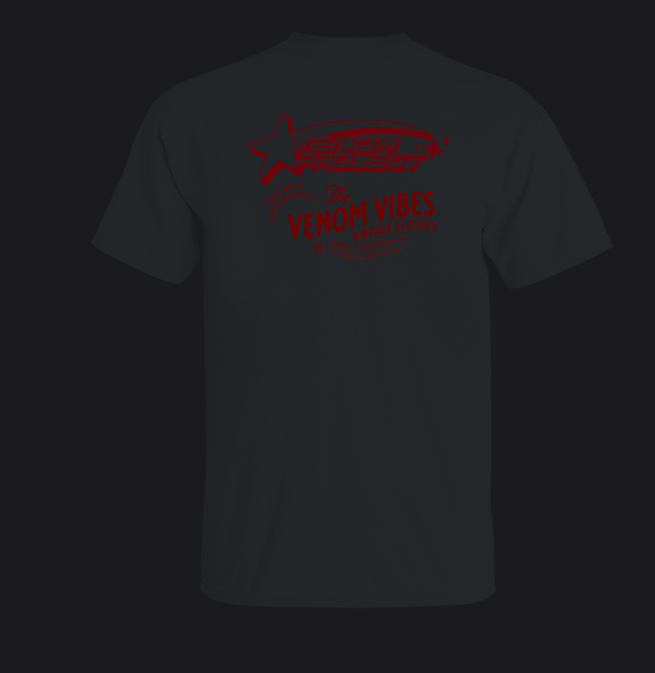Camiseta de la promoción Venom Vibes con diseño bordado en color rojo y fondo de la camiseta negro.